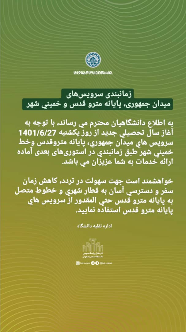 اطلاعيه سرويس هاي دانشجويي دانشگاه صنعتي اصفهان از سطح شهر