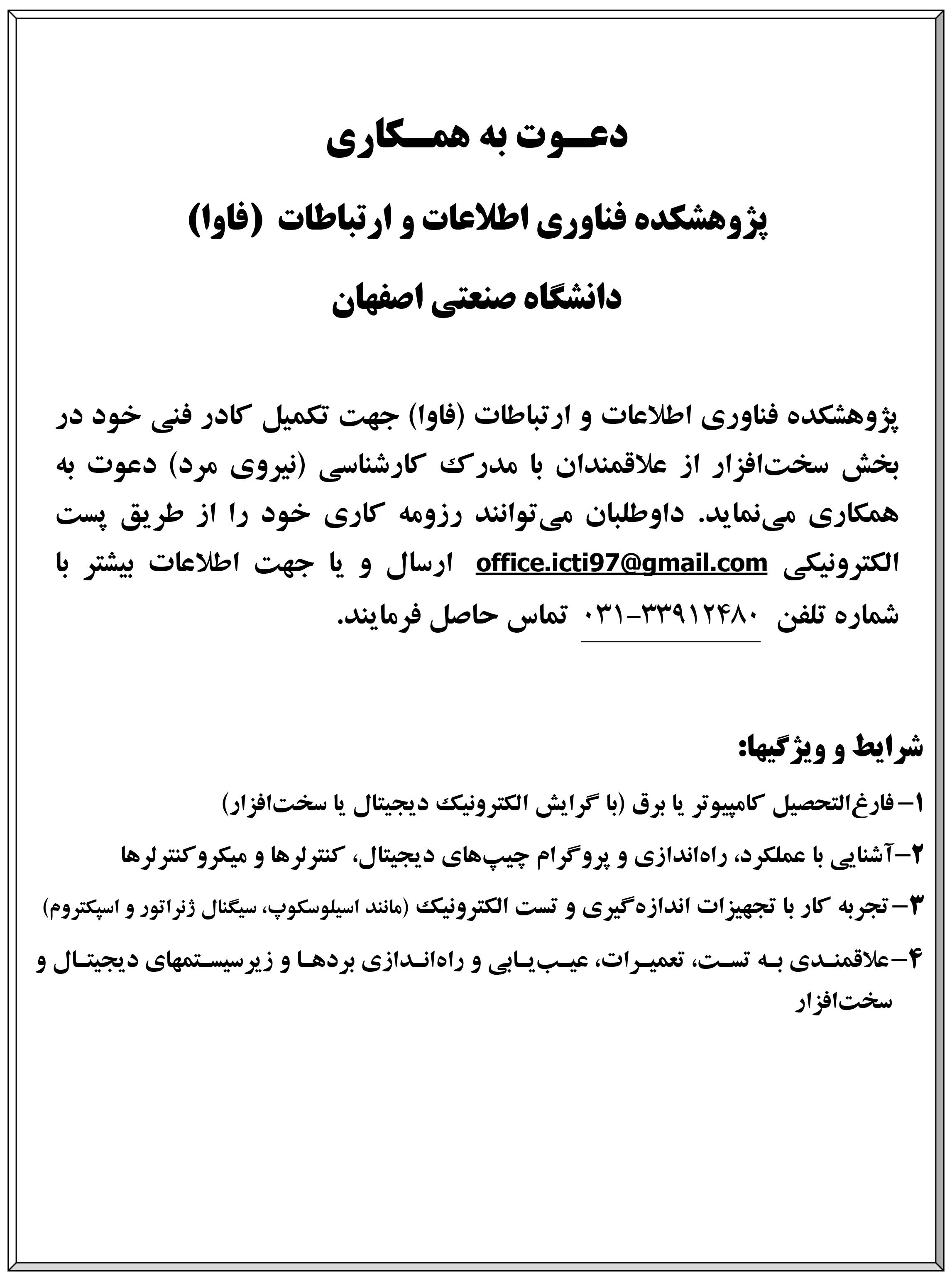 دعـوت به همـکاری پژوهشکده فناوری اطلاعات و ارتباطات (فاوا) دانشگاه صنعتي اصفهان