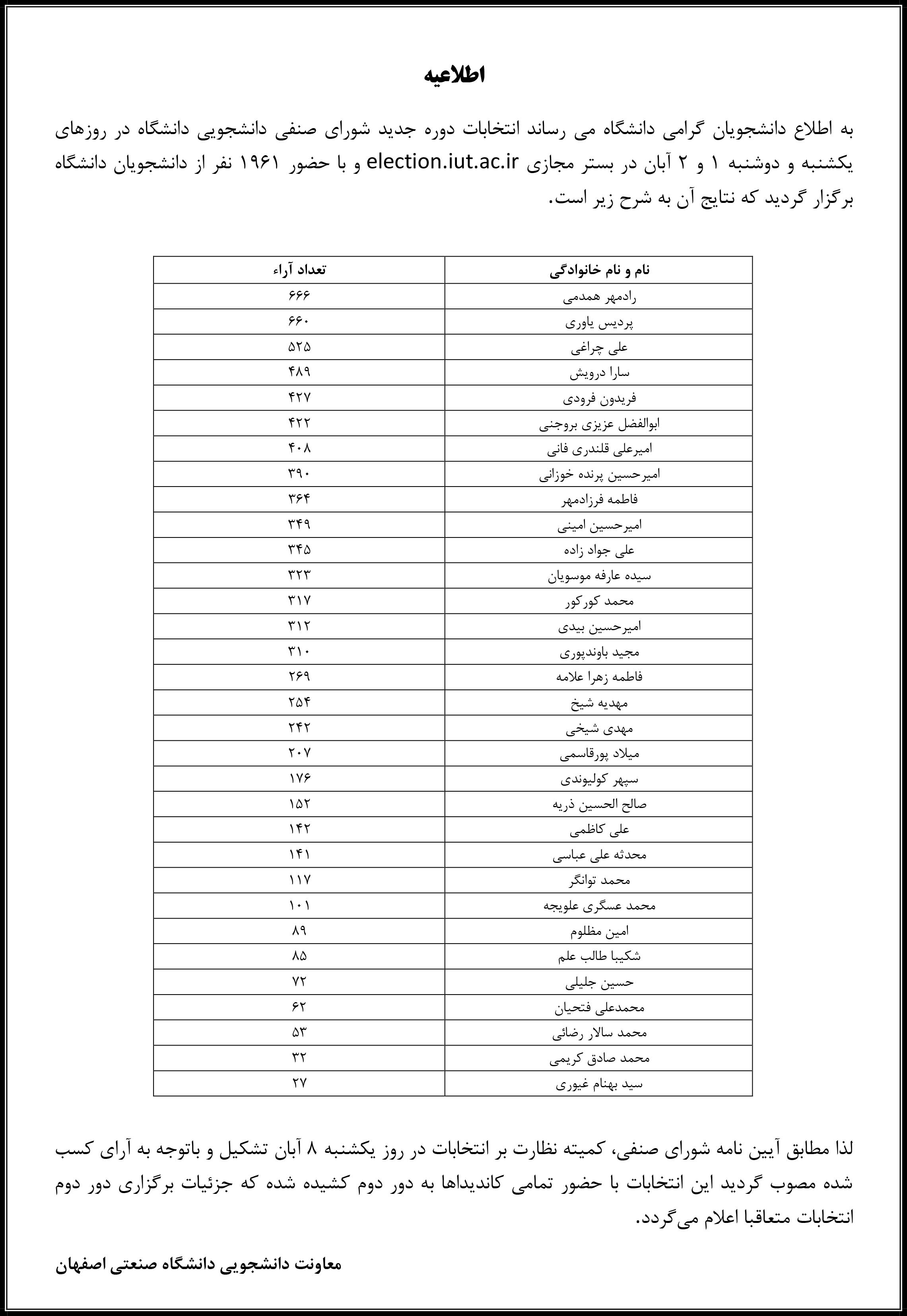 به اطلاع دانشجویان گرامی دانشگاه می رساند انتخابات دوره جدید شورای صنفی دانشجویی دانشگاه در روزهای یکشنبه و دوشنبه ۱ و ۲ آبان در بستر مجازی election.iut.ac.ir و با حضور 1961 نفر از دانشجویان دانشگاه برگزار گردید که نتایج آن به شرح زیر است.