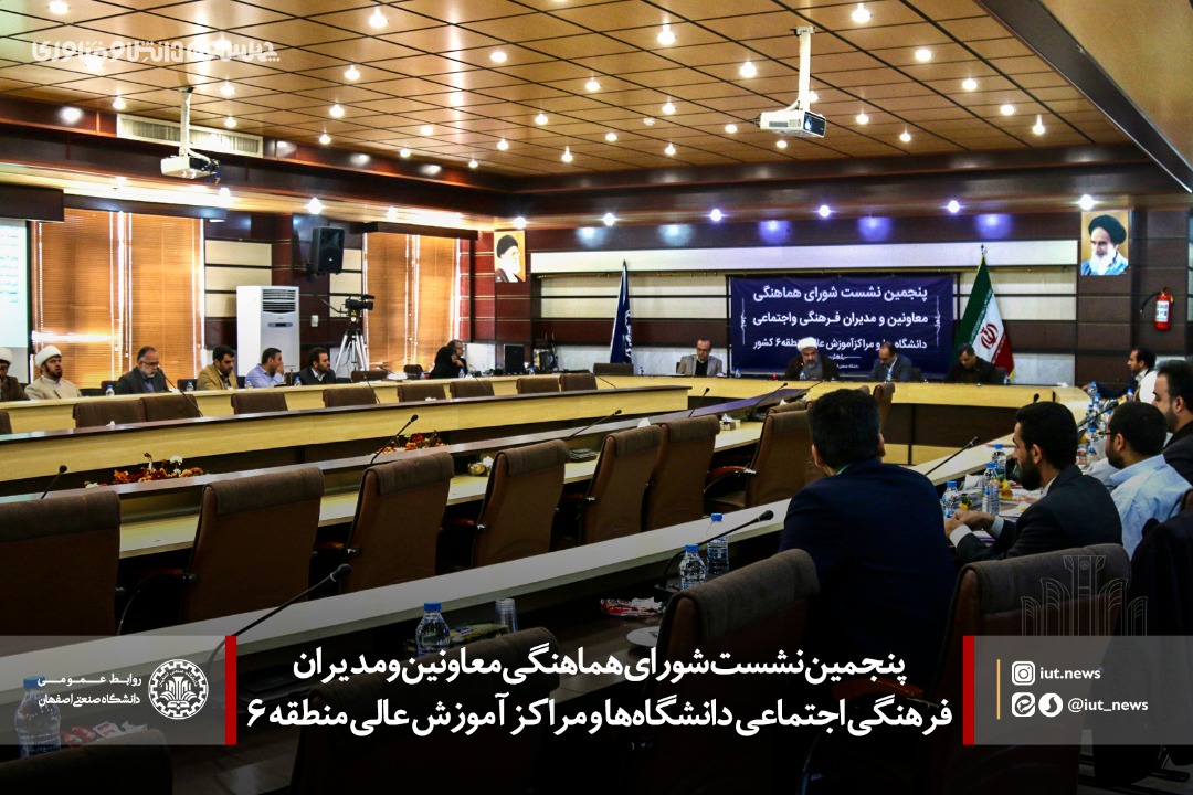 با حضور رئيس دانشگاه صنعتي اصفهان، پنجمين نشست شوراي هماهنگي معاونين و مديران فرهنگي اجتماعي دانشگاه ها و مراكز آموزش عالي منطقه 6 كشور، صبح امروز در مجتمع فرهنگي آموزشي ارديبهشت دانشگاه صنعتي اصفهان برگزار شد.