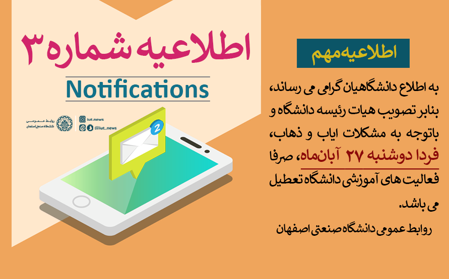 بر اساس تصمیم هیات رئیسه دانشگاه صنعتي اصفهان و با توجه به مشكلات اياب و ذهاب دانشگاهيان گرامي، صرفا فعاليتهاي آموزشي دانشگاه صنعتي اصفهان در روز دوشنبه 27 آبان ماه تعطيل خواهد بود.