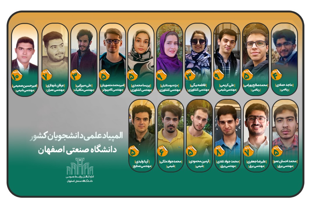 همچنين 24 دانشجوي ديگر دانشگاه صنعتي اصفهان موفق به راه يابي به مرحله نهايي المپياد با رتبه هاي برتر تا 36 در زيرگروه هاي آموزشي خود شدند.