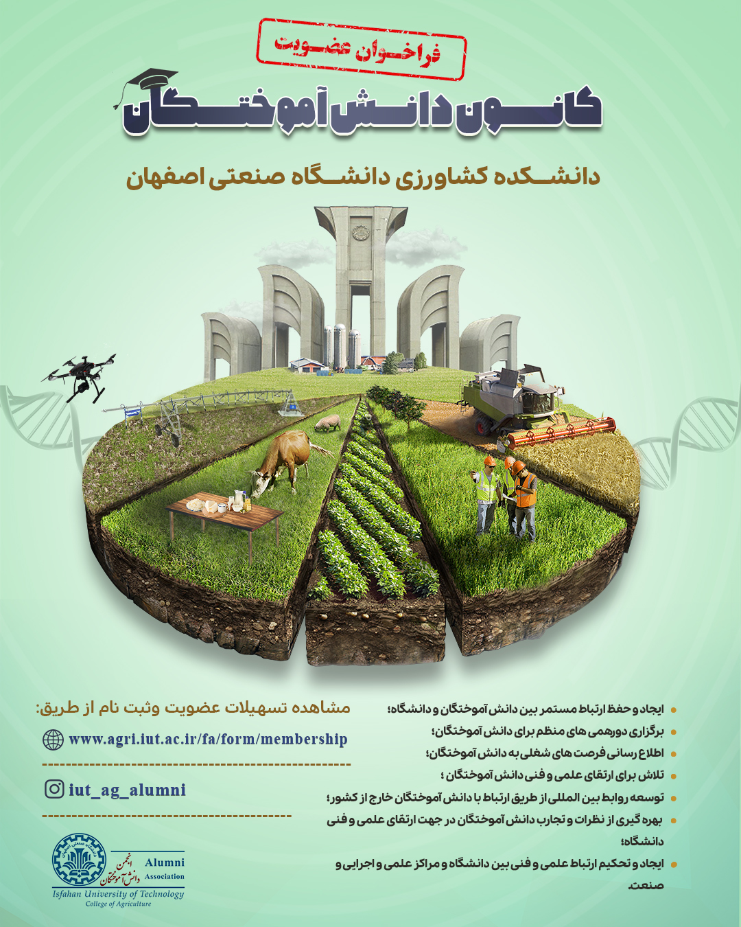 علاقمندان جهت عضویت در کانون دانش آموختگان دانشکده کشاورزی می توانند به نشانی وبگاه : https://agri.iut.ac.ir/fa مراجعه نمایند.