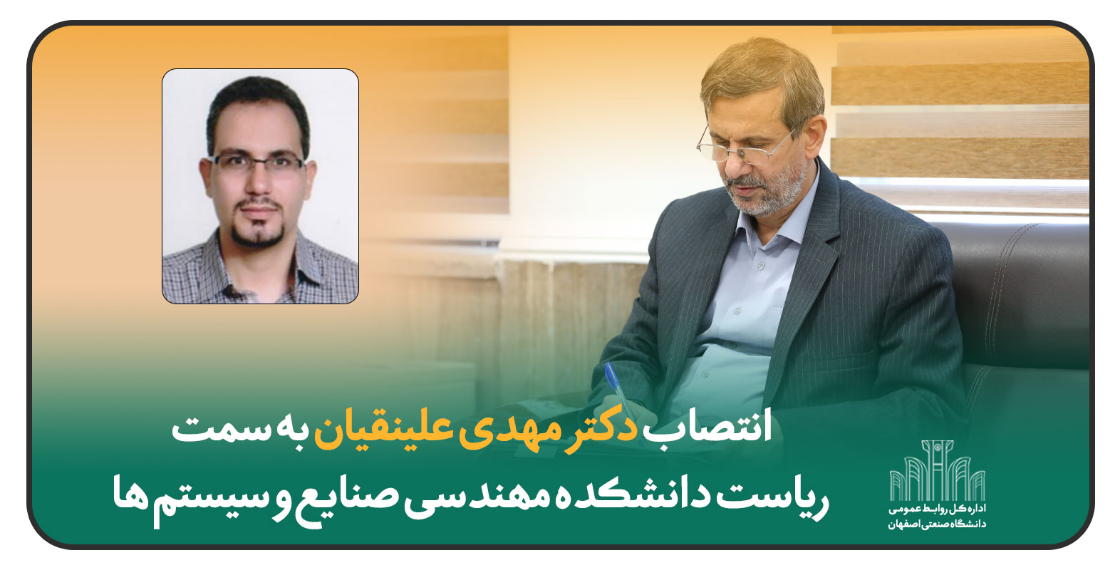 دکتر میبدی، رئیس دانشگاه صنعتي اصفهان، دکتر مهدی علینقیان دانشیار دانشکده مهندسی صنايع و سيستم ها را براي مدت سه سال به سمت رياست این دانشکده منصوب كرد.