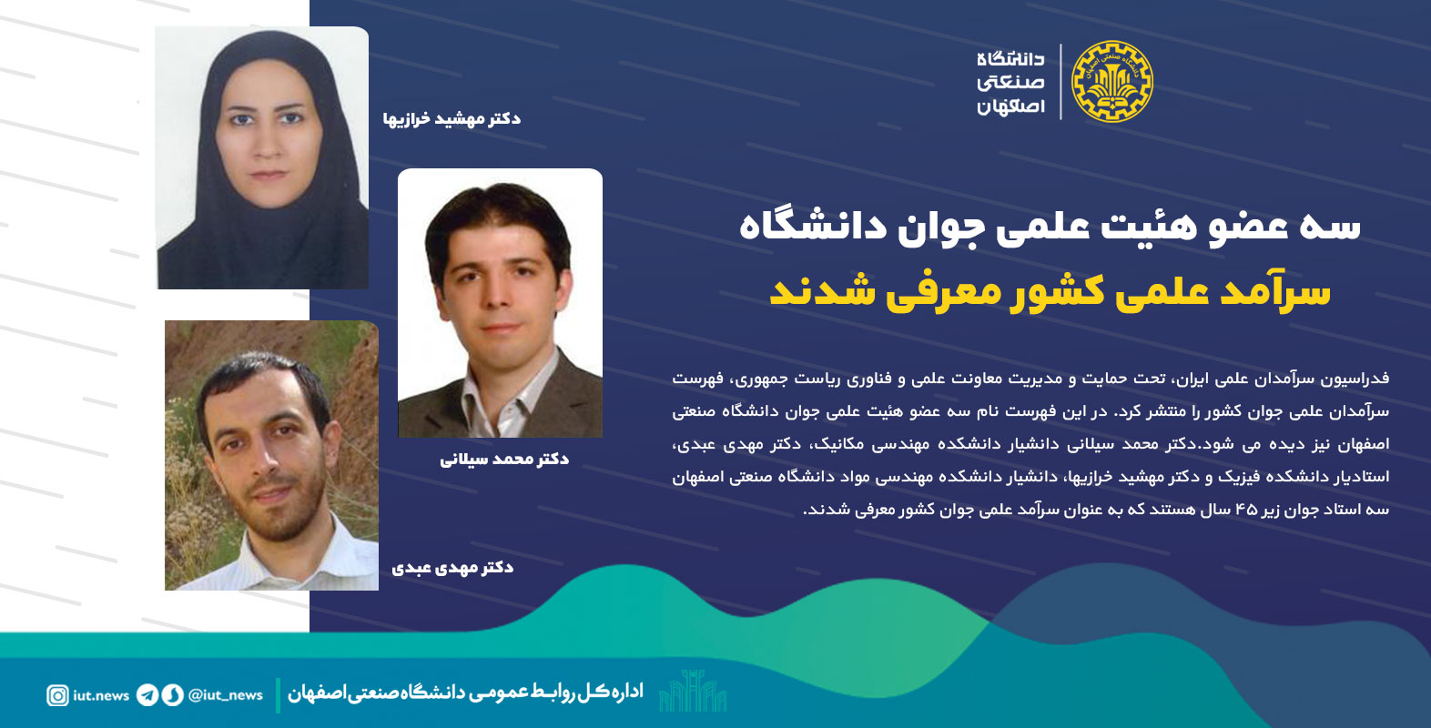 فدراسیون سرآمدان علمی ایران، تحت حمایت و مدیریت معاونت علمی و فناوری ریاست جمهوری، فهرست سرآمدان علمی جوان کشور را منتشر کرد. در این فهرست نام سه عضو هئیت علمی جوان دانشگاه صنعتی اصفهان نیز دیده می شود.دکتر محمد سیلانی دانشیار دانشکده مهندسی مکانیک، دکتر مهدی عبدی، استادیار دانشکده فیزیک و دکتر مهشید خرازیها، دانشیار دانشکده مهندسی مواد دانشگاه صنعتی اصفهان سه استاد جوان زیر 45 سال هستند که به عنوان سرآمد علمی جوان کشور معرفی شدند.