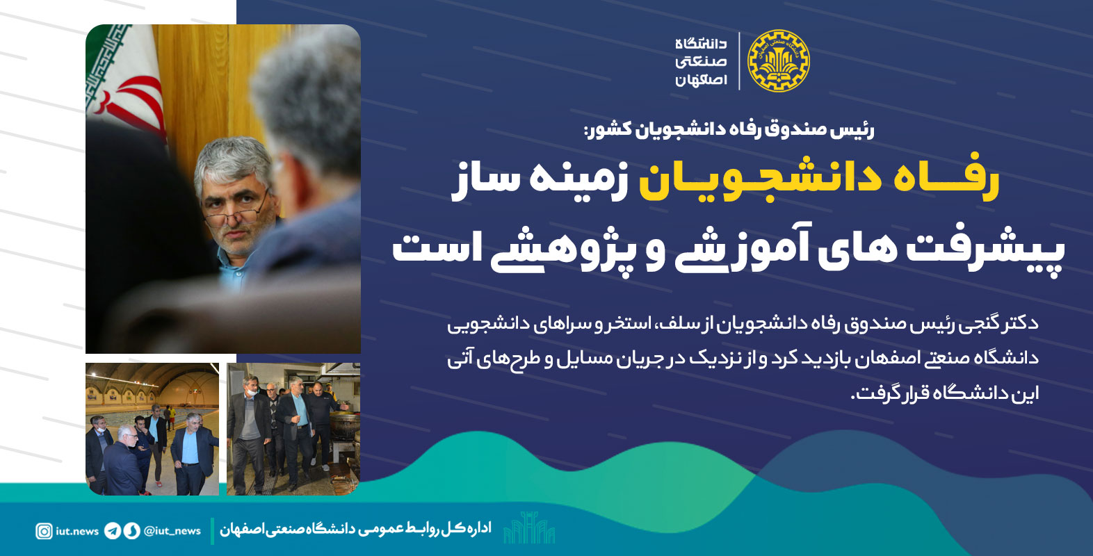 دکتر مسعود گنجی رئیس صندوق رفاه دانشجویان کشور، عصر روز دوشنبه 30 آبان ماه، از امکانات رفاهی دانشجویان دانشگاه صنعتی اصفهان بازدید کرد.