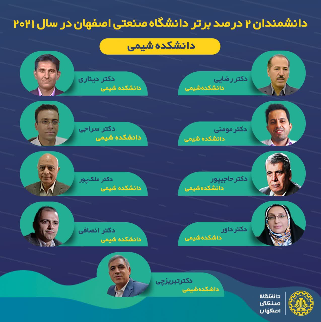 در این فهرست نام اعضای هئیت علمی دانشکده مهندسی مواد دانشگاه صنعتی اصفهان با تعداد 11 هیئت علمی در صدر جدول قرار داد. پس از آن دانشکده شیمی دانشگاه صنعتی اصفهان با 9 عضو هیئت علمی، قرارداد.