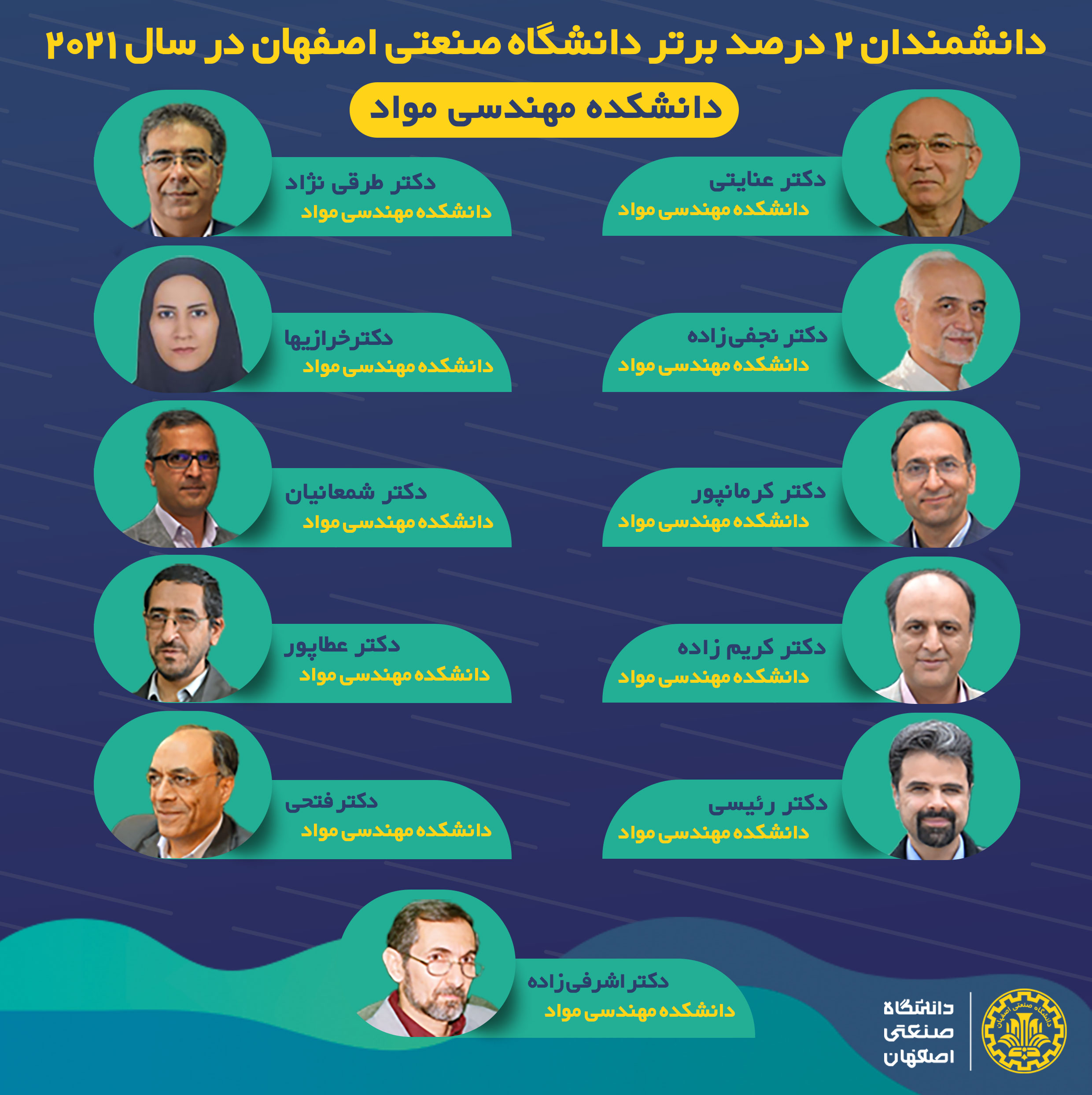 دانشکده مهندسی مواد : خانم دکتر خرازیها – آقایان دکتر : فتحی – نجفی زاده – کرمانپور- کریم زاده – عنایتی- عطاپور- طرقی نژاد- شمعانیان – رئیسی-اشرفی زاده