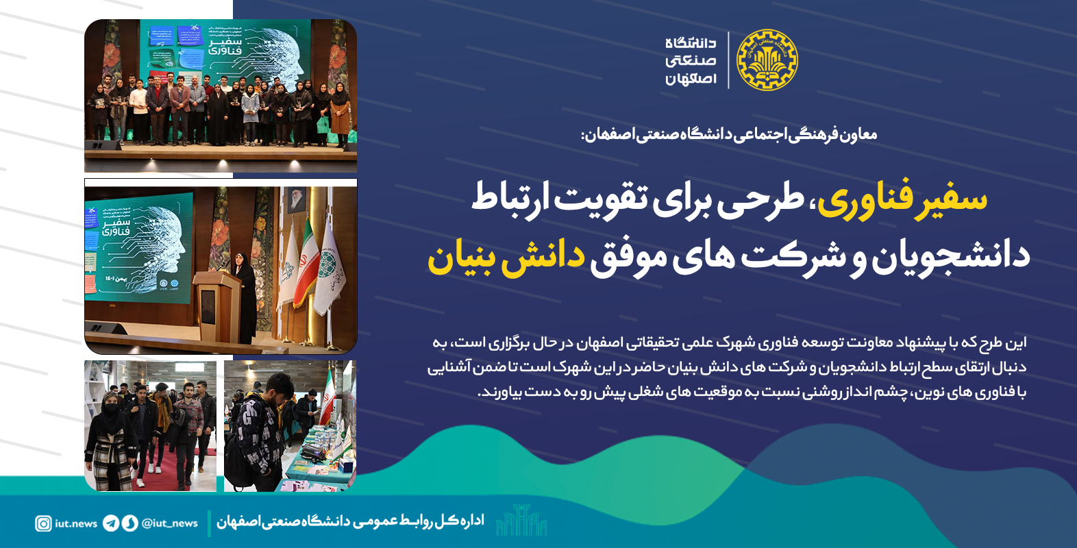 معاون فرهنگی اجتماعی دانشگاه صنعتی اصفهان، با بیان این که نخستین نشست طرح 'سفیر فناوری' با استقبال دانشجویان این دانشگاه برگزار شد؛ گفت: این طرح که با پیشنهاد معاونت توسعه فناوری شهرک علمی تحقیقاتی اصفهان در حال برگزاری است، به دنبال ارتقای سطح ارتباط دانشجویان و شرکت های دانش بنیان حاضر در این شهرک است تا ضمن آشنایی با فناوری های نوین، چشم انداز روشنی نسبت به موقعیت های شغلی پیش رو به دست بیاورند.