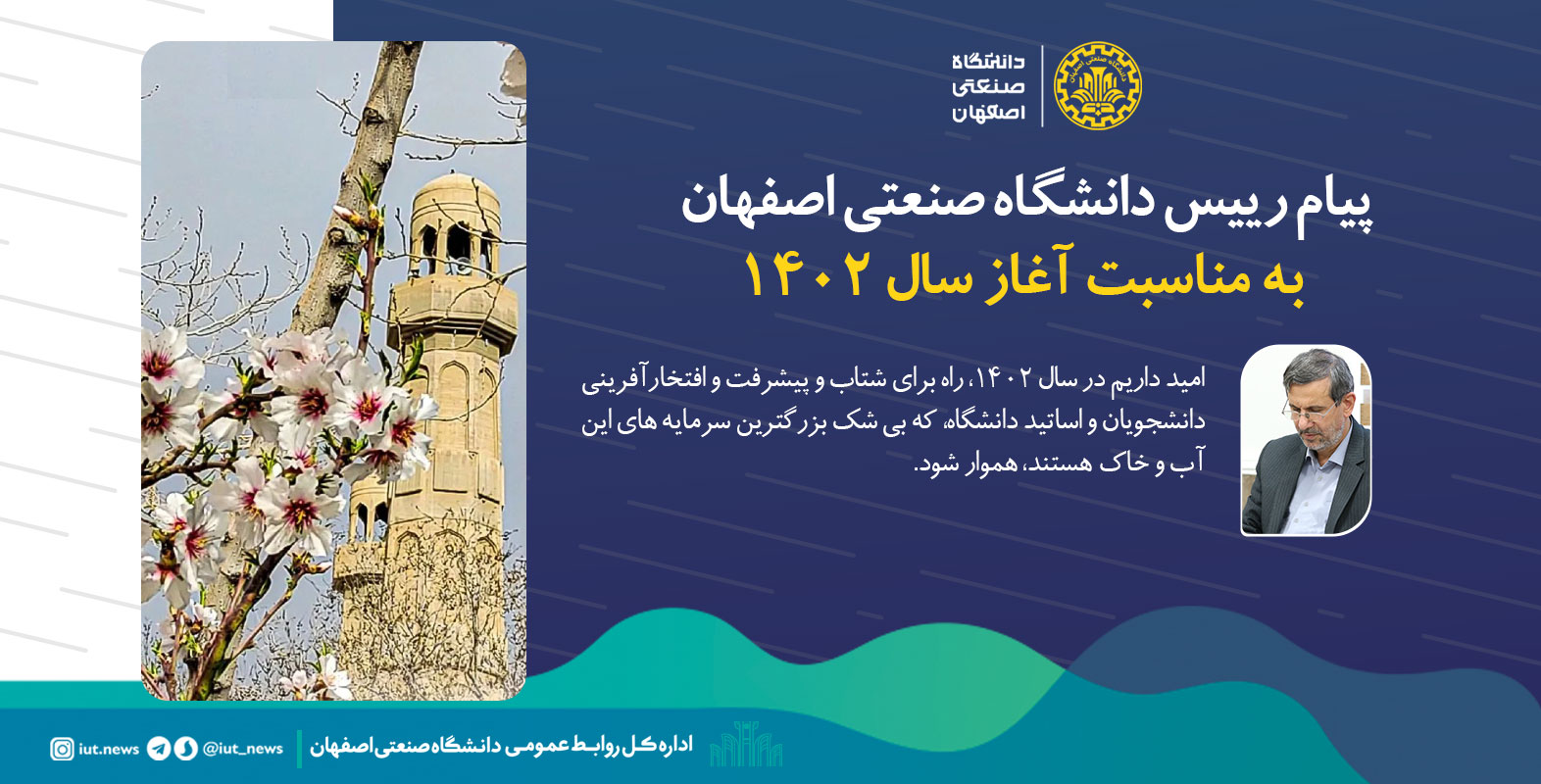 از این فرصت استفاده میکنم و به پاس عید سعید نوروز، صمیمانه ترین شادباش ها دربهار 1402، تقدیم جامعه گرانقدران دانشگاهیان دانشگاه صنعتی اصفهان می نمایم.
