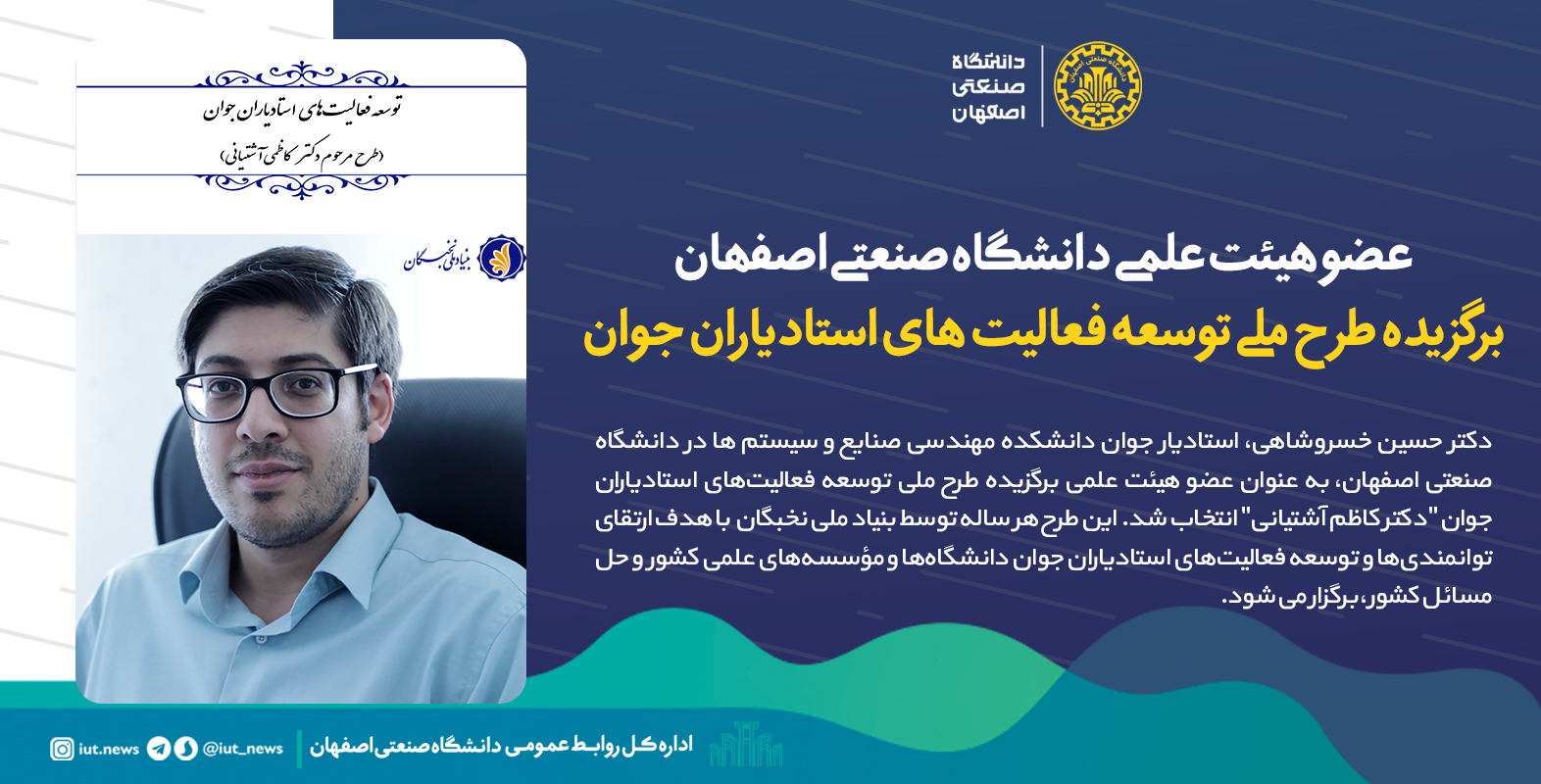 دکتر حسین خسروشاهی، استادیار جوان دانشکده مهندسی صنایع و سیستم ها در دانشگاه صنعتی اصفهان، به عنوان عضو هیئت علمی برگزیده طرح ملی توسعه فعالیت‌های استادیاران جوان 'دکتر کاظم آشتیانی' انتخاب شد.