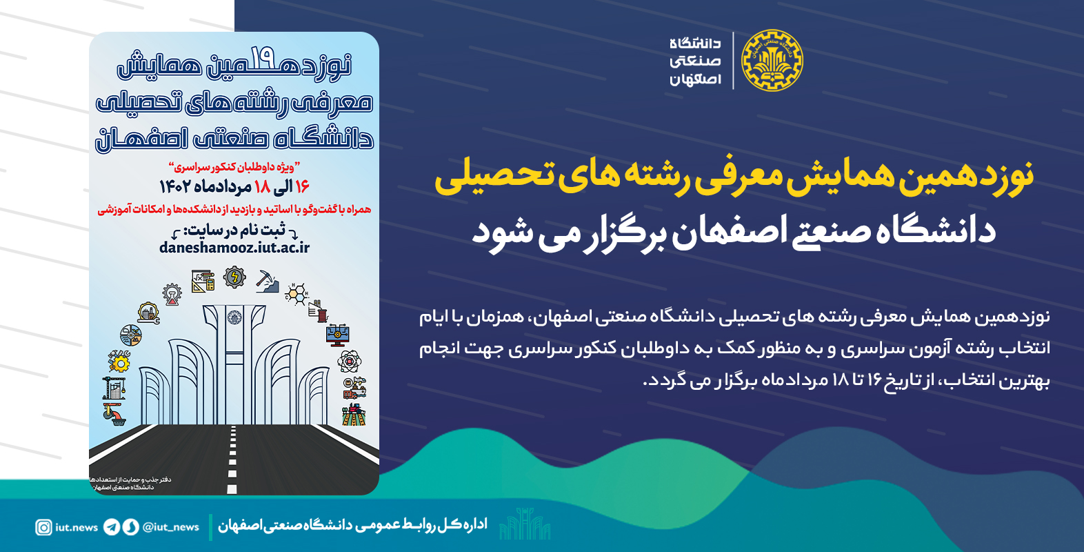 نوزدهمین همایش معرفی رشته های تحصیلی دانشگاه صنعتی اصفهان، همزمان با ایام انتخاب رشته آزمون سراسری و به منظور کمک به داوطلبان کنکور سراسری جهت انجام بهترین انتخاب، از تاریخ 16 تا 18 مردادماه برگزار می گردد.