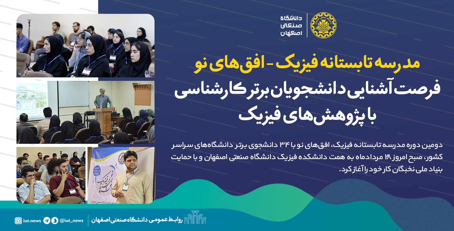 گفتنی است این رویداد علمی، تا یکشنبه 5 شهریورماه برقرار است و دانشجویان ضمن آشنایی با موضوعاتی همچون آزمایشگاه سِرن، اخترفیزیک، ماده تاریک و امواج گرانشی، شبیه‌سازی کوانتومی بلورها و مواد نانو، طراحی حسگرهای پیشرفته و... زیر نظر اساتید برجسته دانشکده فیزیک دانشگاه صنعتی اصفهان، پروژه‌های علمی دراین‌ارتباط اجرا می‌کند.