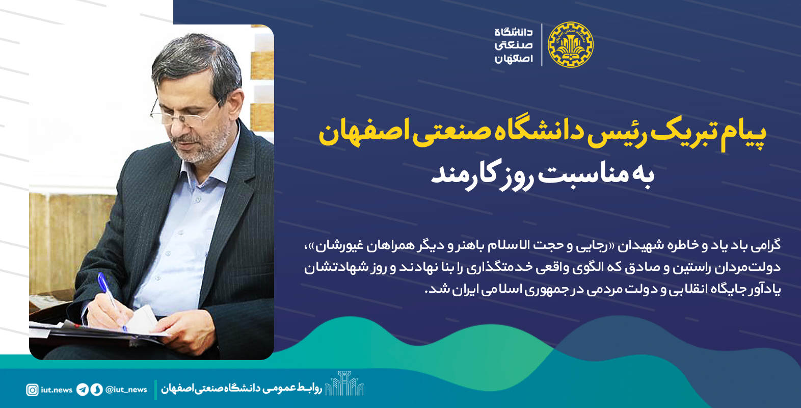 به همین مناسبت فرصت را مغتنم دانسته و روز کارمند را به همه کارمندان شریف و مسئولین متعهد کشور، بهویژه کارکنان پرتلاش دانشگاه صنعتی اصفهان تبریک و تهنیت میگویم.