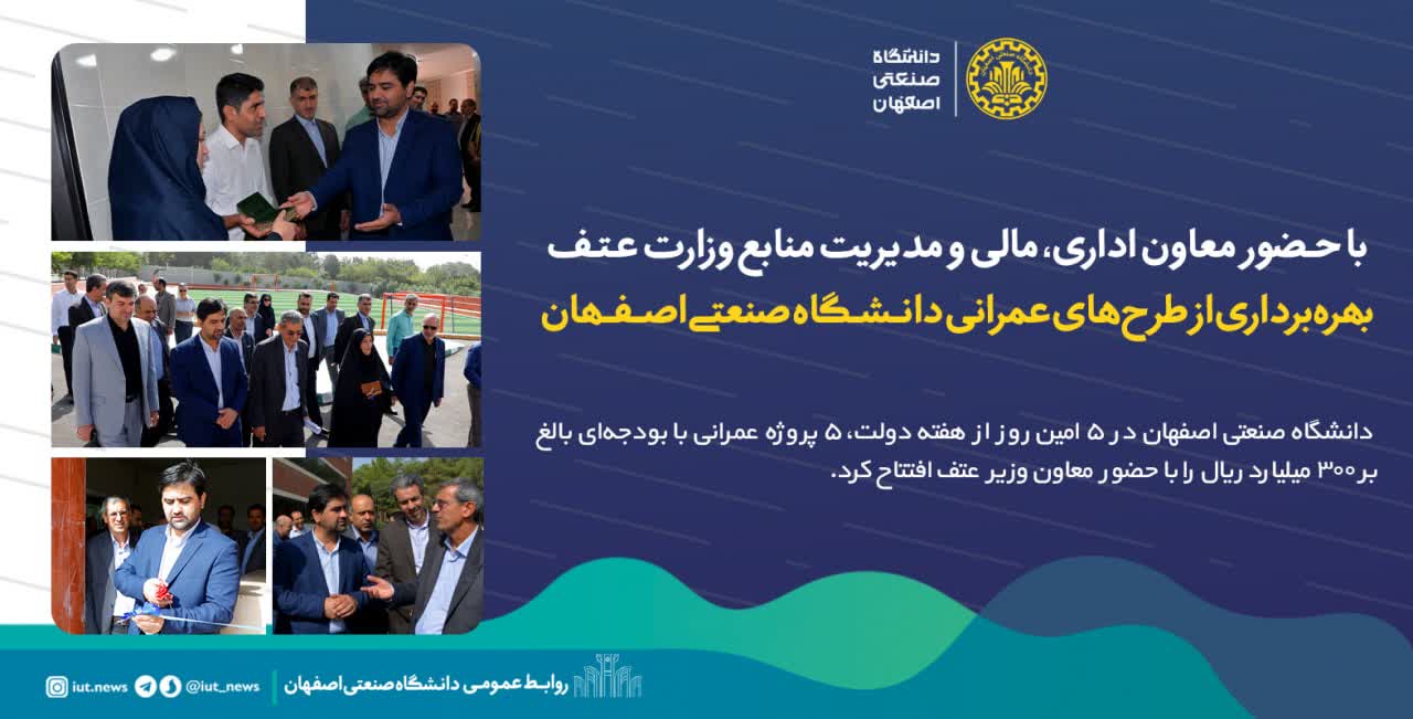 بهرهبرداری از ساختمان جدید مرکز مشاوره و سلامت دانشگاه صنعتی اصفهان، تجهیز و بهره برداری 72واحد مسکونی خوابگاه متأهلین امام جواد (ع)، افتتاح مجموعه باغ مروارید (پارک بانوان) در خوابگاه خواهران، تجهیز و بهرهبرداری از کارگاههای آموزشی ریسندگی و بافندگی دانشکده مهندسی نساجی و تجهیز و بهرهبرداری از آزمایشگاه زبان، از جمله این پروژهها بود که امروز یکشنبه 5 مردادماه، با حضور معاون وزیر افتتاح و بهرهبرداری شد.