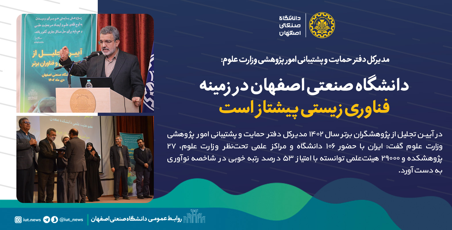 مدیرکل دفتر حمایت و پشتیبانی امور پژوهشی علمی وزارت علوم در جمع پژوهشگران دانشگاه صنعتی اصفهان گفت: ایران با حضور ۱۰۶ دانشگاه و مراکز تحت نظر وزارت علوم، ۲۷ پژوهشکده و ۲۹۰۰۰ هیئتعلمی با امتیاز ۵۳ درصد در شاخصهای نوآوری به دست آورد.