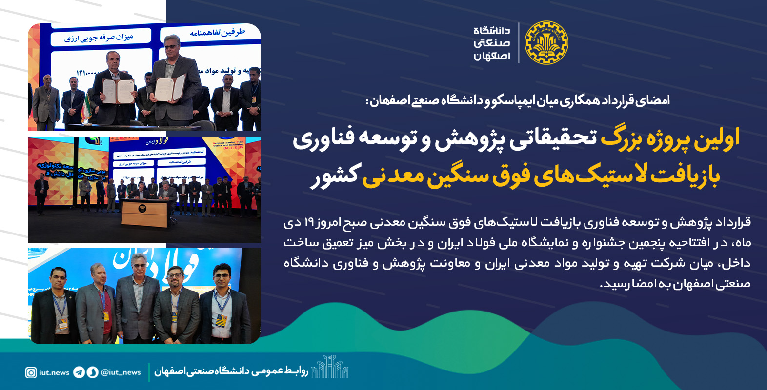 قرارداد پژوهش و توسعه فناوری راهاندازی اولین خط تولید نیمهصنعتی بازیافت لاستیکهای فوق سنگین معدنی صبح امروز ۱۹ دیماه، در افتتاحیه پنجمین جشنواره و نمایشگاه ملی فولاد ایران و در بخش میز تعمیق ساخت داخل، میان شرکت تهیه و تولید مواد معدنی ایران و معاونت پژوهش و فناوری دانشگاه صنعتی اصفهان به امضا رسید.