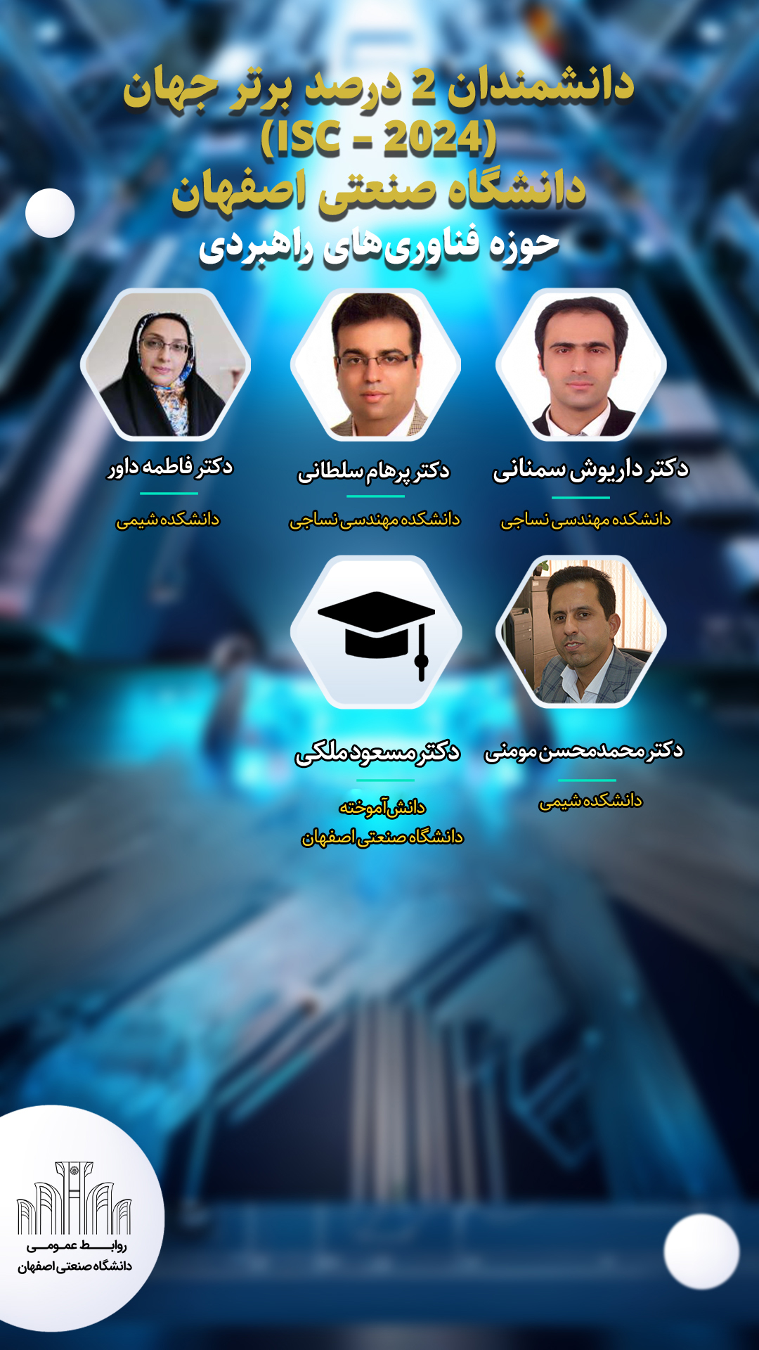 دکتر حسین فرزانه فرد و دکتر احسان ادیب از اعضای هیأت علمی دانشکده مهندسی برق و کامپیوتر، دکتر احمد سوهانکار، دکتر محمد رضا سلیم پور و دکتر مهدی جوانبخت از اعضای هیأت علمی دانشکده مهندسی مکانیک، دکتر داوود مستوفی نژاد؛ عضو هیأت علمی دانشکده مهندسی عمران، دکتر علی اصغر انصافی، عضو هیأت علمی دانشکده شیمی و دکتر سید سعید اسلامیان، عضو هیأت علمی دانشکده مهندسی کشاورزی، دیگر پژوهشگران 2 درصد برتر جهان در حوزه موضوعی مهندسی از دانشگاه صنعتی اصفهان هستند.