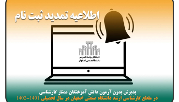 اطلاعيه تمديد ثبت نام پذيرش بدون آزمون دانش آموختگان ممتاز كارشناسي در مقطع كارشناسي ارشد دانشگاه صنعتي اصفهان در سال تحصيلي 1402-1401