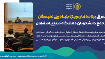 معرفی برنامه های ویژه بنیاد ملی نخبگان استان اصفهان در جمع دانشجویان دانشگاه صنعتی اصفهان